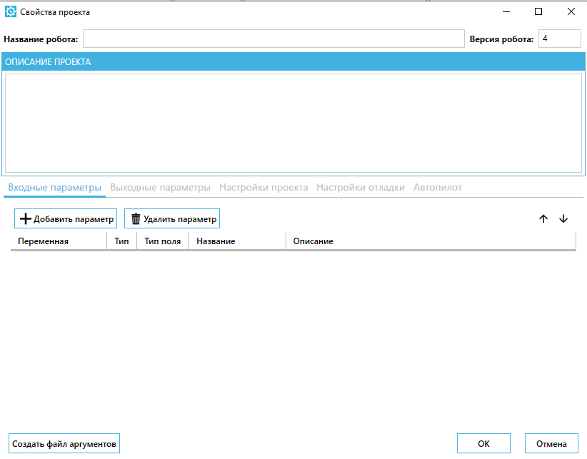 <table data-header-hidden><thead><tr><th width="70"></th><th width="229"></th><th></th></tr></thead><tbody><tr><td><strong>No.</strong><br><strong>p/p</strong></td><td><strong>Interface Element</strong></td><td><strong>Description</strong></td></tr><tr><td>1.</td><td>text field "Robot Name"</td><td>Name of the Robot.</td></tr><tr><td>2.</td><td>text field "Robot Version"</td><td>Version of the Robot.</td></tr><tr><td>3.</td><td>text field "Project Description"</td><td>Description of the project.</td></tr><tr><td>4.</td><td>tab "Input Parameters"</td><td>Allows specifying the input parameters of the project if they were previously specified.</td></tr><tr><td>4.1.</td><td>button "Add Parameter"</td><td>Allows adding an input parameter to the project.</td></tr><tr><td>4.2.</td><td>button "Remove Parameter"</td><td>Allows removing an input parameter from the project.</td></tr><tr><td>4.3.</td><td>button "Move Up"</td><td>Moves the selected input parameter up in the list.</td></tr><tr><td>4.4.</td><td>button "Move Down"</td><td>Moves the selected input parameter down in the list.</td></tr><tr><td>4.5.</td><td>column "Variable"</td><td>Project variable that can be selected from a dropdown list.</td></tr><tr><td>4.6.</td><td>column "Type"</td><td>Type of the project's input parameter.</td></tr><tr><td>4.7.</td><td>column "Field Type"</td><td>Type of the project's input parameter field.</td></tr><tr><td>4.8.</td><td>column "Name"</td><td>Name of the project's input parameter.</td></tr><tr><td>4.9.</td><td>column "Description"</td><td>Description of the project's input parameter.</td></tr><tr><td>4.10.</td><td>button "Create Argument File"</td><td>Generates a file with arguments based on the specified project parameters.</td></tr><tr><td>5.</td><td>tab "Output Parameters"</td><td>Allows specifying the output parameters of the project if they were previously specified.</td></tr><tr><td>5.1.</td><td>button "Add Parameter"</td><td>Allows adding an output parameter to the project.</td></tr><tr><td>5.2.</td><td>button "Remove Parameter"</td><td>Allows removing an output parameter from the project.</td></tr><tr><td>5.3.</td><td>button "Move Up"</td><td>Moves the selected output parameter up in the list.</td></tr><tr><td>5.4.</td><td>button "Move Down"</td><td>Moves the selected output parameter down in the list.</td></tr><tr><td>5.5.</td><td>column "Variable"</td><td>Project variable that can be selected from a dropdown list.</td></tr><tr><td>5.6.</td><td>column "Type"</td><td>Type of the project's output parameter.</td></tr><tr><td>5.7.</td><td>column "Field Type"</td><td>Type of the project's output parameter field.</td></tr><tr><td>5.8.</td><td>button "Create Argument File"</td><td>Generates a file with arguments based on the specified project parameters.</td></tr><tr><td>6.</td><td>tab "Project Settings"</td><td>Allows specifying immutable parameters for the project, such as configuration constants, their types, and descriptions of each parameter's purpose.</td></tr><tr><td>6.1.</td><td>button "Add New Row"</td><td>Adds a new row for entering a configuration constant.</td></tr><tr><td>6.2.</td><td>button "Remove Row"</td><td>Removes the selected row with the constant.</td></tr><tr><td>6.3.</td><td>button "Add Existing"</td><td>Allows adding previously created constants to the list.</td></tr><tr><td>6.4.</td><td>button "Reset Value"</td><td>Resets the constant value to default.</td></tr><tr><td>6.5.</td><td>button "Move Up"</td><td>Moves the selected row up in the list.</td></tr><tr><td>6.6.</td><td>button "Move Down"</td><td>Moves the selected row down in the list.</td></tr><tr><td>6.7.</td><td>column "Configuration Constant"</td><td>Displays the name of the project's configuration constant.</td></tr><tr><td>6.8.</td><td>column "Type"</td><td>Shows the type of the constant (<code>Text</code> or <code>Credentials</code>).</td></tr><tr><td>6.9.</td><td>column "Description (for user)"</td><td>Contains the description and purpose of the constant for the end user.</td></tr><tr><td>7.</td><td>tab "Debugging Settings"</td><td>Allows specifying input parameters related to the debugging process of scripts.</td></tr><tr><td>7.1.</td><td>button "Clear"</td><td>Allows clearing all current debugging parameter values.</td></tr><tr><td>7.2.</td><td>button "Refresh"</td><td>Refreshes the list or values of debugging parameters, applying the latest changes.</td></tr><tr><td>7.3.</td><td>column "Name"</td><td>Contains the names of debugging input parameters.</td></tr><tr><td>7.4.</td><td>column "Type"</td><td>Displays the type of each parameter.</td></tr><tr><td>7.5.</td><td>column "Value"</td><td>Shows the current values of the parameters, which can be edited if necessary.</td></tr><tr><td>7.6.</td><td>button "Create Argument File"</td><td>Generates a file with arguments based on the specified parameters for use in the debugging process.</td></tr><tr><td>8.</td><td>tab "Autopilot"</td><td>Allows specifying settings that control the automatic execution of scripts, as well as a list of connected Python modules.</td></tr><tr><td>8.1.</td><td>tab "Main Settings"</td><td>Contains parameters that control the behavior of the autostart.</td></tr><tr><td>8.1.1.</td><td>checkbox "Allow running without user confirmation of input parameters"</td><td>Allows scripts to run automatically without the need for user confirmation of parameters.</td></tr><tr><td>8.1.2.</td><td>checkbox "Prohibit displaying input parameters in chat"</td><td>Prohibits displaying the input parameters of the script in the chat, ensuring confidentiality.</td></tr><tr><td>8.1.3.</td><td>checkbox "Prohibit displaying output parameters in chat"</td><td>Prohibits displaying the output parameters of the script in the chat, ensuring confidentiality.</td></tr><tr><td>8.1.4.</td><td>button "Create Argument File"</td><td>Generates a file with arguments for the automatic execution of scripts.</td></tr><tr><td>8.2.</td><td>tab "Python Modules"</td><td>Displays a list 