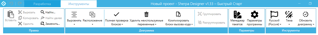The "Tools" panel contains the main actions for configuring and managing projects and Robot diagrams. The main menu includes: