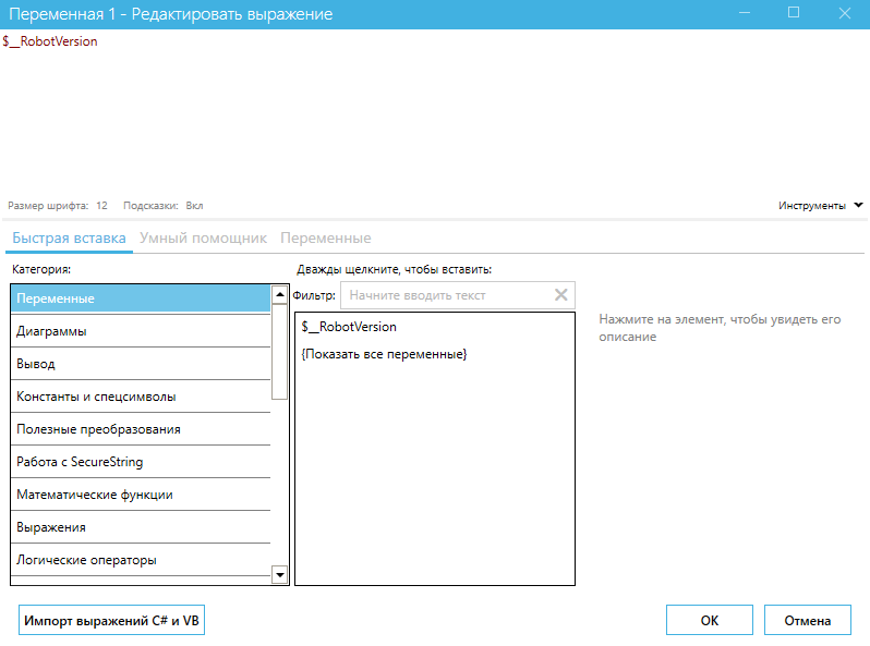 <table data-header-hidden><thead><tr><th width="52"></th><th width="213"></th><th></th></tr></thead><tbody><tr><td><strong>No.</strong></td><td><strong>Interface Element</strong></td><td><strong>Description</strong></td></tr><tr><td>1.</td><td>"Font Size"<br><img src="https://3212714295-files.gitbook.io/~/files/v0/b/gitbook-x-prod.appspot.com/o/spaces%2FI0zUnKkOuy6lWt7DZ46u%2Fuploads%2Fgit-blob-7808aa2d300b8b06f82c661e6ba0372613e29e25%2F2025-09-22_22-27-04.png?alt=media" alt=""></td><td>Allows you to select a comfortable font size in the "Edit Expression" window.</td></tr><tr><td>2.</td><td>"Hints"<br><img src="https://3212714295-files.gitbook.io/~/files/v0/b/gitbook-x-prod.appspot.com/o/spaces%2FI0zUnKkOuy6lWt7DZ46u%2Fuploads%2Fgit-blob-c94cdd547094d5cd954991b650a6039b554c8f54%2F2025-09-22_22-29-21.png?alt=media" alt=""></td><td>Allows you to enable or disable hints in the "Edit Expression" window. This function indicates errors in expressions, if any.</td></tr><tr><td>3.</td><td>"Tools"<br><img src="https://3212714295-files.gitbook.io/~/files/v0/b/gitbook-x-prod.appspot.com/o/spaces%2FI0zUnKkOuy6lWt7DZ46u%2Fuploads%2Fgit-blob-9e0e0dd3f60adcd722d9f8f7c3b206bf3b4f0ff4%2F2025-09-22_22-31-33.png?alt=media" alt=""></td><td>Allows you to insert into the line the property values, file(s) path, directory, or insert with character escaping (quotes, dollar sign).</td></tr><tr><td>4.</td><td>"Import C# and VB Expressions"<br><img src="https://3212714295-files.gitbook.io/~/files/v0/b/gitbook-x-prod.appspot.com/o/spaces%2FI0zUnKkOuy6lWt7DZ46u%2Fuploads%2Fgit-blob-2c7ae3971935300a4973dba77601564528239cc6%2Fimage%20(4).png?alt=media" alt=""></td><td>Allows you to import C# and VB expressions. When the button is clicked, a window opens with a text field for pasting the expression, as well as the option to select the expression language “C#”, “Blue Prism”, “Visual Basic”.</td></tr></tbody></table>