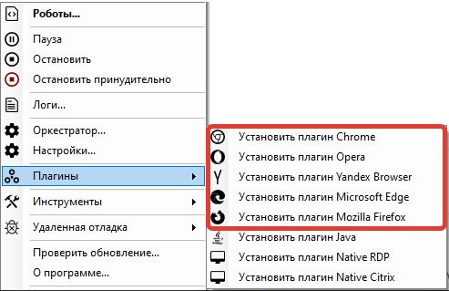 To choose the plugin you want to install, right-click on the icon ![](https://3199517203-files.gitbook.io/~/files/v0/b/gitbook-x-prod.appspot.com/o/spaces%2F4mXXYsqBuhj7RyX6Y4Yw%2Fuploads%2Fgit-blob-c8272222bd879233a05a3452716d274a2981e8a5%2F%D0%B8%D0%B7%D0%BE%D0%B1%D1%80%D0%B0%D0%B6%D0%B5%D0%BD%D0%B8%D0%B5%20\(63\).png?alt=media) in the tray, select "Plugins" from the context menu, and then choose the desired plugin: