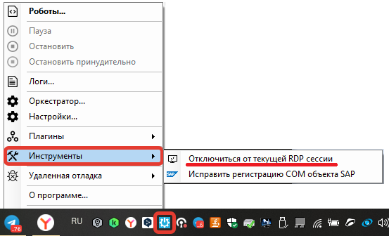 1. Launch the Assistant and find the menu item in the tray: "Tools" -> "Disconnect from the current RDP session".