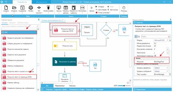 Например, при распознавании документа в формате .pdf в проекте сценария добавляем блок «Получить текст со страницы OCR». В настройках результатов во вкладке «Выход» указываем $DocPageText