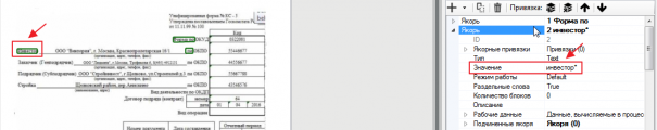 Слева якорем будет выступать слово «Инвестор». Добавляем якорь, нажимаем левой клавишей мыши на OCR-блок «Инвестор» и Шаблонизатор автоматически заполняет строку «Значение», тем самым определяя якорную точку.