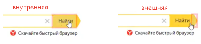Итак, после ввода нашего текста для поиска необходимо нажать кнопку Найти. Нажмём кнопку записи. Обратите внимание, при наведении мыши на кнопку Найти происходит ситуация, аналогичная описанной ранее – есть внутренняя часть кнопки, и есть внешняя часть кнопки, и они друг в друга вложены.