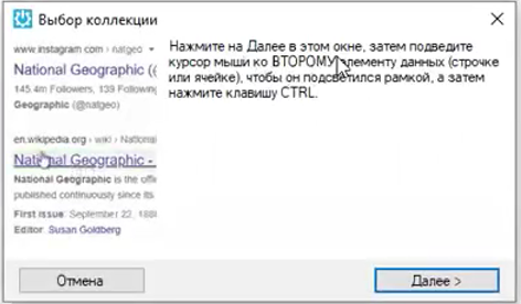 При нажатии кнопки система рекомендует нажать кнопку Далее, подвести курсор мыши к образцу элемента с данными (строка или ячейка), которые нужно добавить, для подсветки рамкой данного элемента, и затем нажать CTRL.