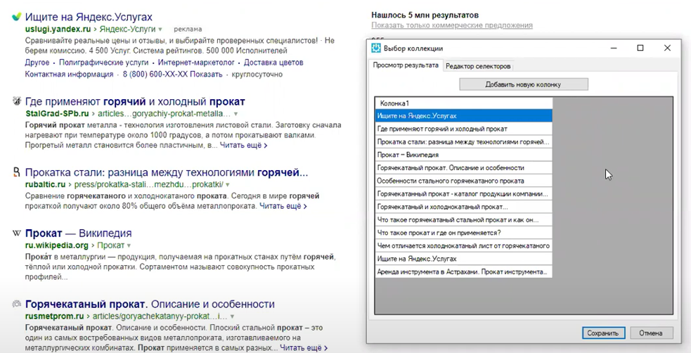 В окне представлены извлечённые со страницы результатов все 10 результатов поиска на основе двух отобранных нами образцов. Эти результаты можно автоматически сохранить в таблицу данных.