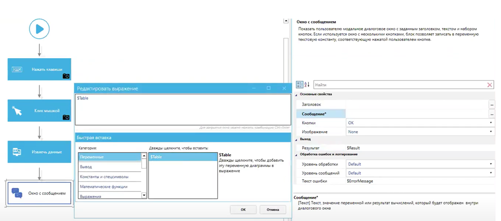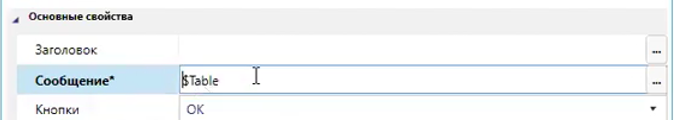 В свойствах блока выберем нашу переменную Table. Из неё будет взят текст сообщения, выводимого на экран