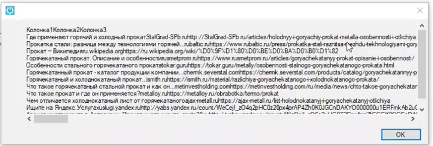 После поиска результатов по запросу появилось окно, в котором вы видите содержимое всех трёх колонок. Данные не разделены, но тем не менее здесь записана вся извлеченная информация.