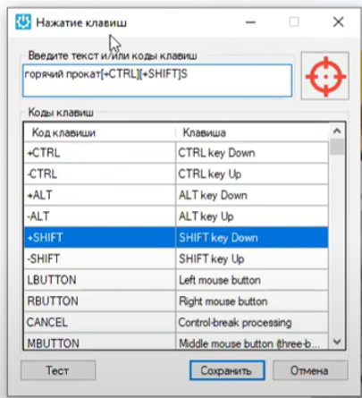 Такой код, записанный в текстовом поле, позволит проэмулировать нажатие комбинации клавиш CTRL+Shift+S.