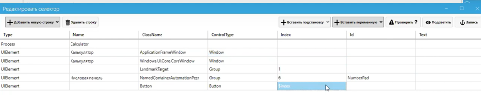 Таким образом, мы сможем быстро пройти и прокликать по всем пунктам этого списка, даже если мы не знаем, сколько там значений. Возвращаясь к примеру с калькулятором, мы так делали в одном проекте, где нужно было показывать клики мышкой по разным кнопкам, выбирать произвольные числа, складывать их и вычитать и т.д. Можно было, конечно, записать 10 кликов по 10 кнопкам, а потом выбирать с помощью 10 условий (если значение переменной = 1, то кликаем по такой-то кнопке и т.д.). Но мы обошлись одним блоком клика, т.к. внутри этого блока в селекторе, в колонке Index прописали переменную Index, содержащую порядковый номер.