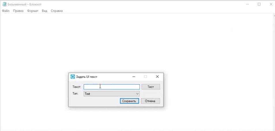 Кнопки для записи действий работают достаточно однотипно. Например, откроем Блокнот и нажмём кнопку “Задать текст элементу”.