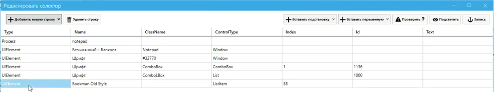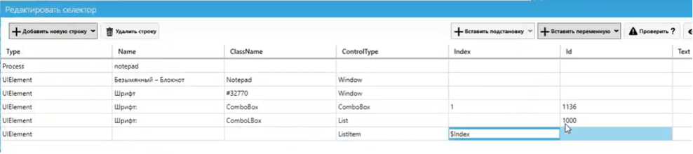 Обратите внимание на последнюю строку. В ней есть имя шрифта и его порядковый номер в списке — 38 (в колонке Index). Получается, что на компьютере, где мы собираемся выполнять сценарий, мы должны всегда иметь этот шрифт в списке шрифтов под номером 38. Если условие не выполнится, робот не выберет этот пункт. Можно сделать так, чтобы робот выбирал именно шрифт BookmanOldStyle безотносительно его номера в списке, т.к. в разных ОС номер может различаться. Или наоборот, будет выполняться перебор позиций списка, так, чтобы был выбран шрифт под конкретным номером независимо от его имени. Мы можем либо удалить порядковый номер, и тогда мы будем искать конкретно BookmanOldStyle, либо удалить название шрифта и искать по индексу. И здесь будет полезно, как обычно при задачах перебора, подставлять переменные в ячейки селектора. Это можно сделать с помощью кнопки “Вставить переменную”.