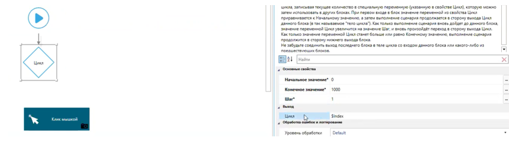 Если клик мышью будет неуспешным, т.е. мы не найдём индекс какого-то пункта этого списка, возникнет ошибка. Соединим коннектор “Если ошибка” с входом следующего после цикла блока (Лог). Пропишем нашу переменную Index в селекторе.