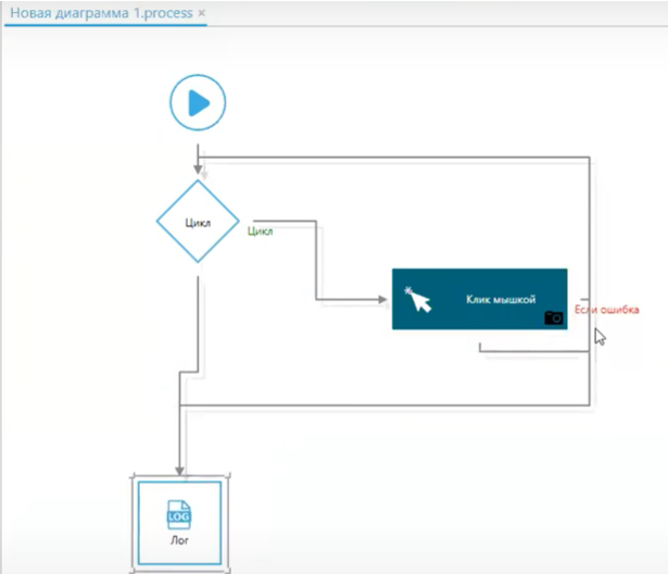 Теперь подключим к выходу цикла блок “Клик мышкой”, т.е. просто прокликаем по всем этим пунктам. Выход блока “Клик мышкой” соединим с началом цикла и поставим следующий блок – “Лог”.