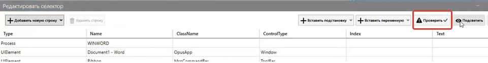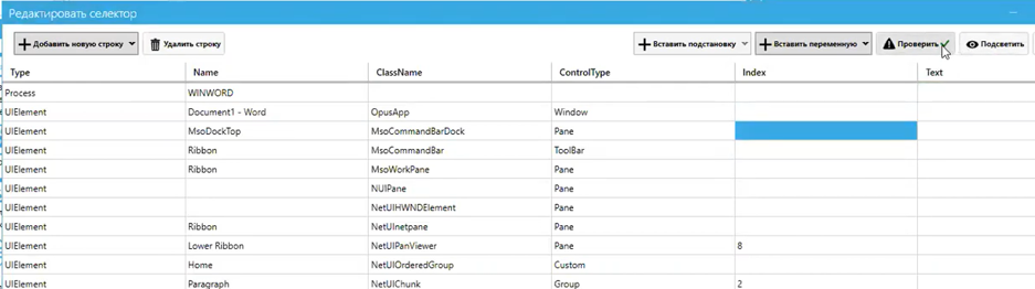 Для начала попробуем ослабьте одно из условий, находящихся в проблемной строке. Пробуйте начать с условия Index. Удалите значение этой ячейки (2), нажмите на кнопку Проверить. Открывается окно с заголовком Document1 – Word, т.е. всё работает правильно. В таблице селектора на кнопке Проверить появляется зелёная галочка. Формальная проверка селектора пройдена.