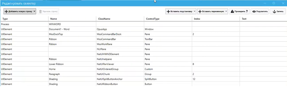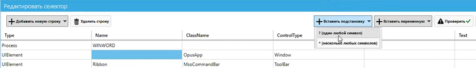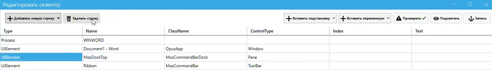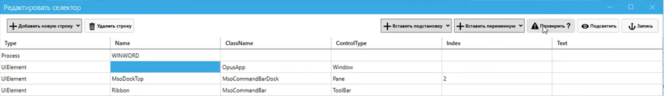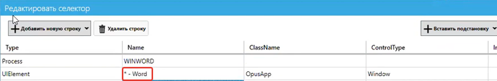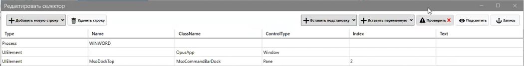 Первой строкой происходит поиск приложения WINWORD. Второй строкой происходит поиск окна с заголовком Document1 – Word, т.е. как раз поиск документа с конкретным названием Document1. Это не входит в условие задачи. Необходимо сделать так, чтобы сценарий работал независимо от того, какой документ открыт. Самое простое, что можно сделать – удалить содержимое этой ячейки и сохранить таблицу селектора в таком виде.