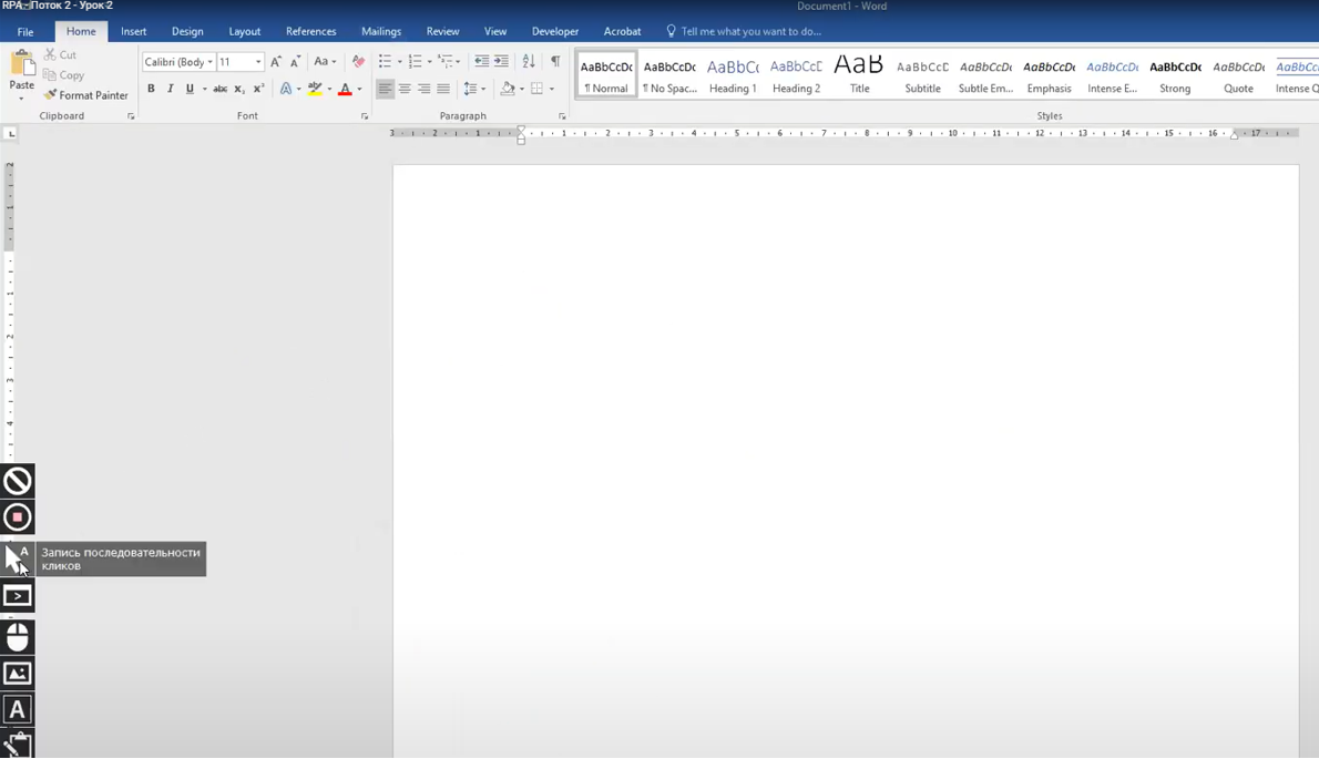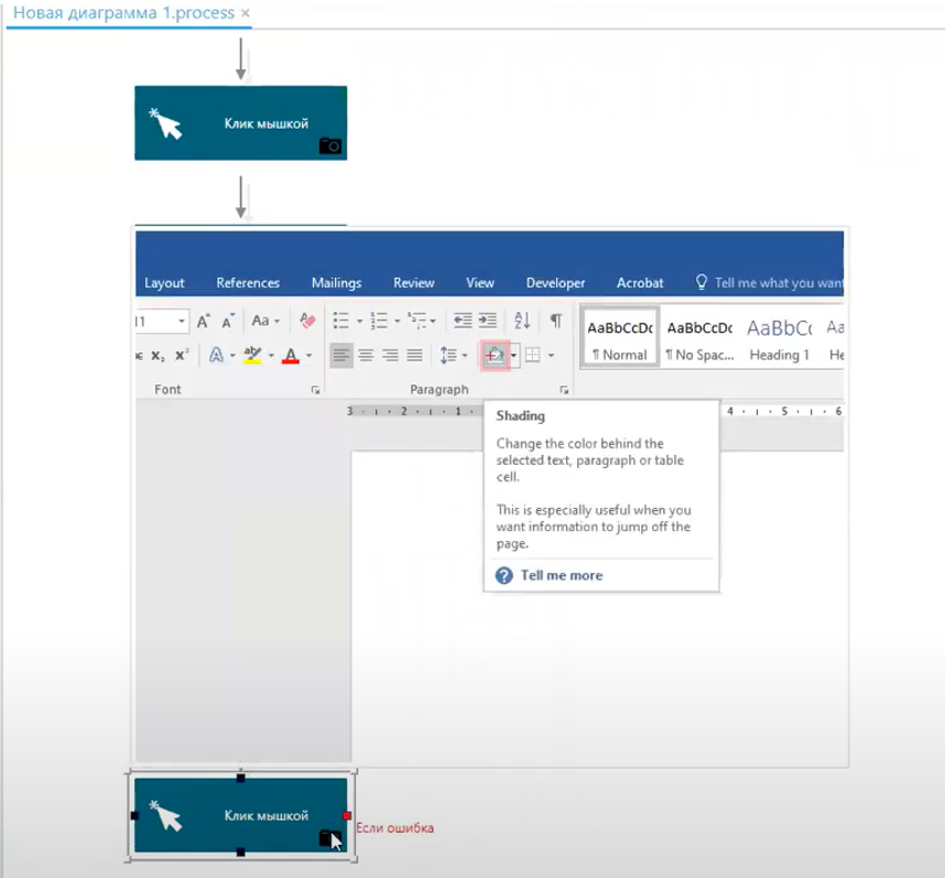 Попробуйте записать клик по какой-нибудь кнопке в окне Word, например, на кнопке заливки цветом. Нажмите на кнопку для записи последовательности кликов.